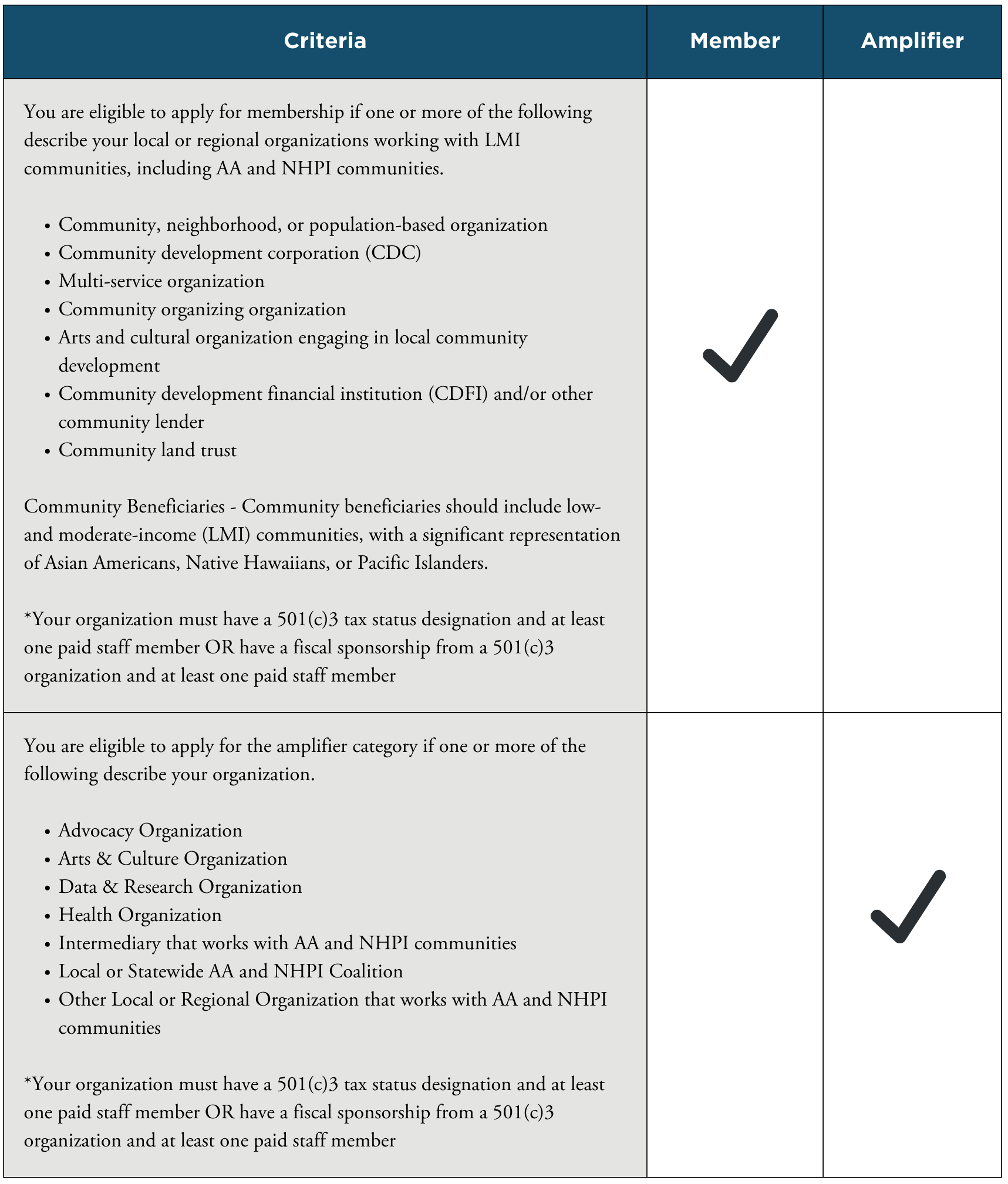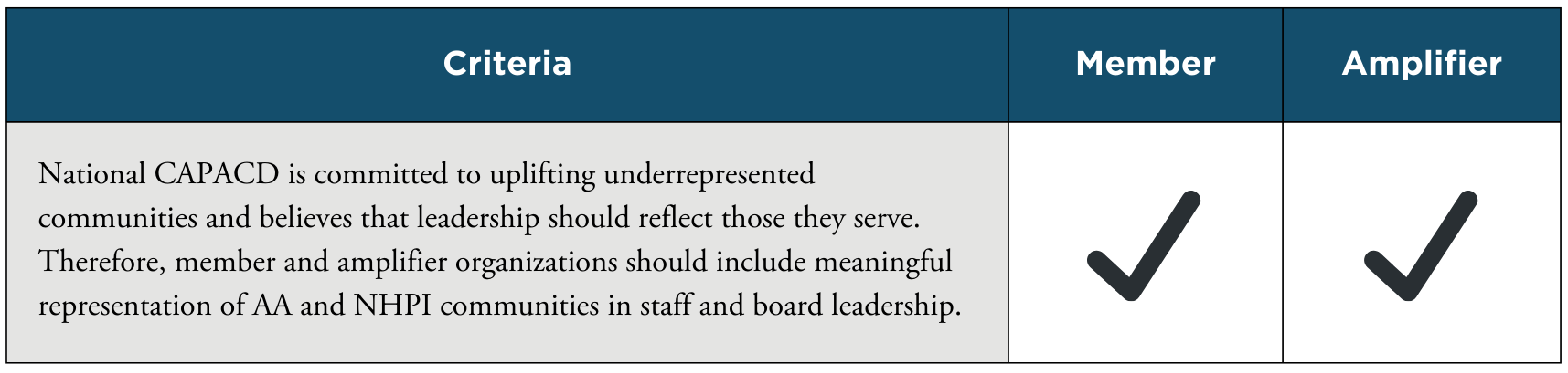 As National CAPACD strategically grows our coalition, organizations can apply to formally join one of two categories. Read more below to understand which category – membership or amplifier – is right for your organization. If you are unsure which category your organization qualifies for, please reach out to membership@nationalcapacd.org to schedule a time to discuss further.